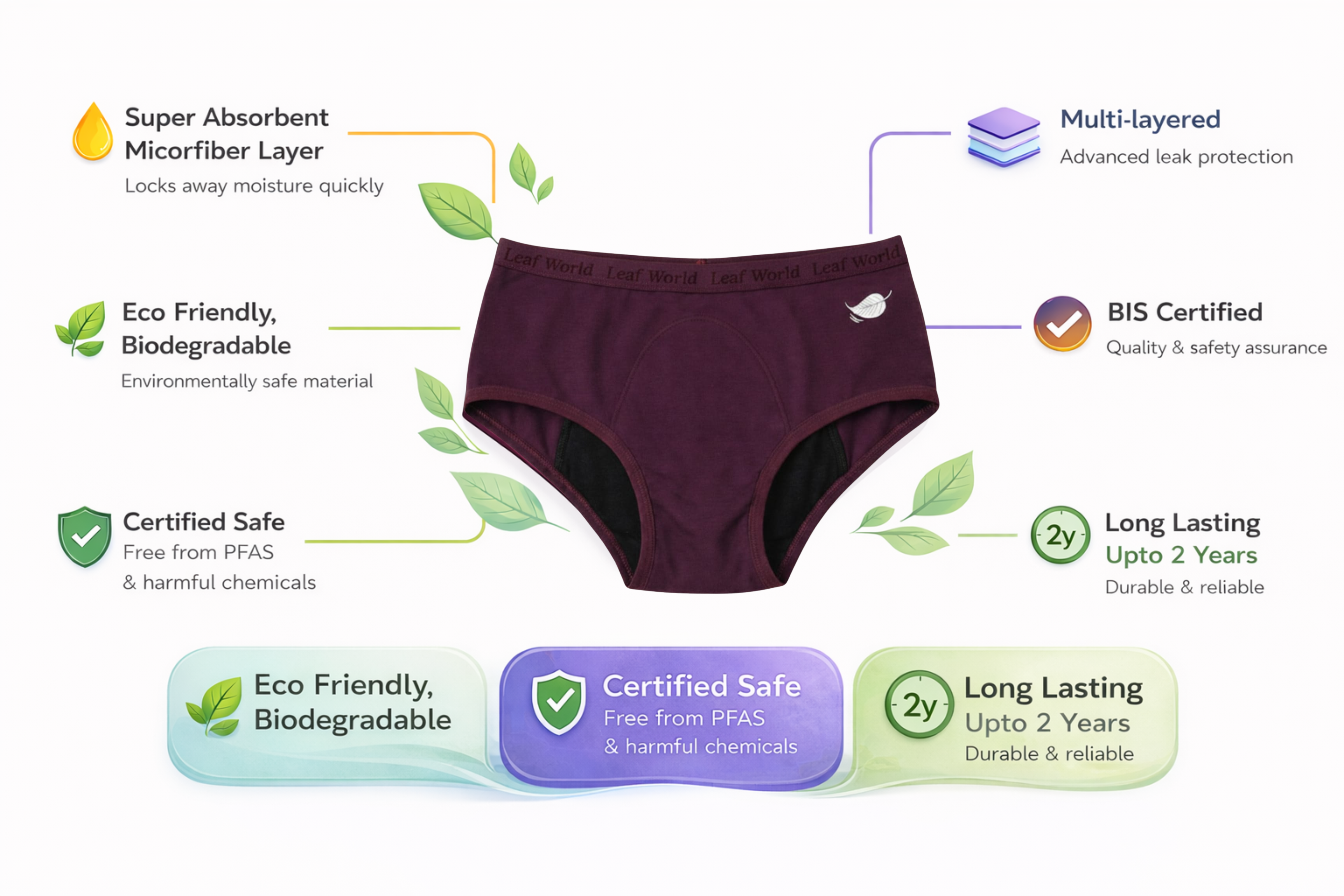 Integrated menstrual protection made from 4 ultra-fine materials. Guaranteed zero humidity, zero odor, zero leaks.